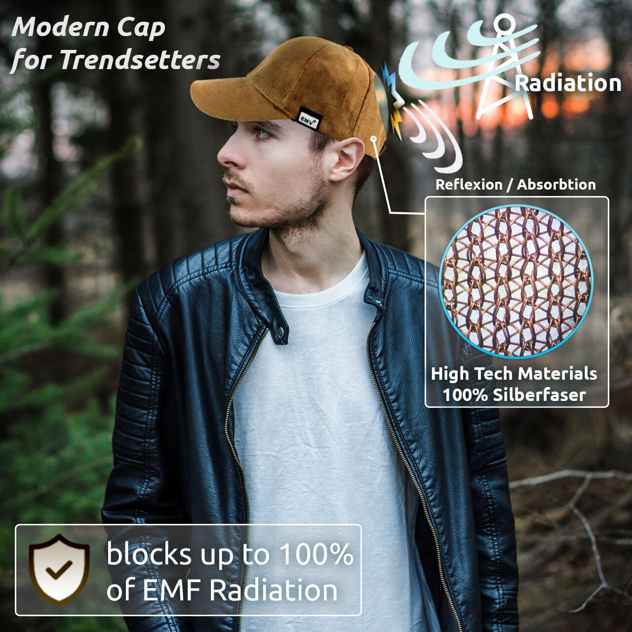 頭部を電磁場から守るコーデュロイキャップ